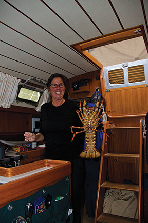 Another great place was Pickersgill Harbour, named by Captain Cook for the lieutenant on his second voyage to New Zealand. We may have even tied a stern line to the same horizontal tree he did 239 years ago! While anchored and tied up in the snug cove, a charter fishing boat pulled up and asked if we like crayfish. “Yes!” we exclaimed. In no time, a bin filled with five prickly crustaceans was handed over the lifelines. Our buckets and pot were wholly inadequate for their large size, and I fumbled as they tried to escape, but we managed to cook and devour each one.