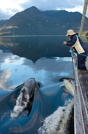 With 20 knots on the nose and pelting rain, we made our way down Doubtful Sound to the Tasman Sea. The image may suggest misery, but rain in Fiordland brings the mountains and forests to life. Hundreds of waterfalls flow like white ribbons draped over gigantic rumpled green gifts, and the wind reminds you of where you are in the world.