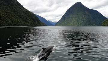 Southern Winds, the green Department of Conservation boat with dolphin researchers on board, had left Doubtful Sound behind us, quickly passed, and was now hovering just inside the protected waters. It was a reassuring sight. As we neared the head of Breaksea Sound, we were again joined by bottlenose dolphins who escorted us to the anchorage. The researchers on Southern Winds waved and cheered as they saw our companions at the bow. They, and one other fishing boat, were all we saw that day.