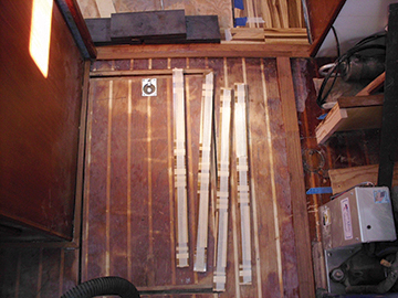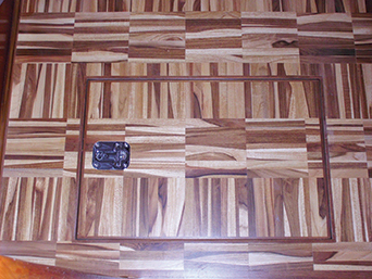To align the flooring pattern on the hatches, they were laid into the holes and centered. Lines were then drawn on the hatches to indicate intersections with the alternating patterns of the glued down flooring. Back in the woodshop, the cutout fields of flooring were glued to each hatch, trimmed flush on the router table and trimmed with teak strips.