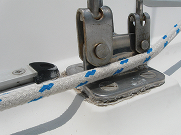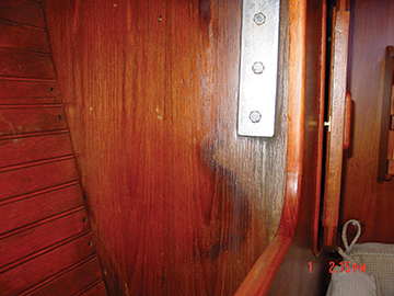 Chainplates that have a rod attached on the underside and are then attached to the hull need some special attention, as there are usually toggles or turnbuckles fitted to the rod. Check that all fittings and fasteners are tight and secure. Any leaks will often run down the rod causing corrosion at the ends of the fittings. The rods and fittings need to be carefully inspected for corrosion, cracking and elongation. Check the hull attachment members as well. If glassed in, look for any signs of delamination or cracking in the fiberglass. Also, a moisture meter can be helpful for checking structural members made of glass over wood.