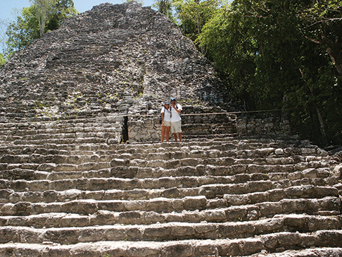 The ferry from Isla Mujeres took us to Cancun, where we hired a taxi to the bus terminal. A reasonable fare got us passage on an air-conditioned bus to Coba, the site of Mayan ruins dating back to the 500s. Not as large as Chichen Itza to the west, Coba has only recently been recaptured from the surrounding jungle. Fewer tourists visit Coba, and the ruins are closer to their original condition than the restored sites of other Mayan cities. Ancient roadways, called sacbe, built by the Mayas lead visitors among the ruins by foot or on rented bikes. Among the ruins are several temples, two ball courts, and countless stele, large stone slabs with writing and glyphs. The ancient pyramid at Coba is the tallest in the Yucatan Peninsula and visitors are still allowed to climb its 120 steps. From the top, 138 feet above the jungle, you can see other pyramids and lakes across the land that was once a large city. It is possible to visit Coba and still arrive back in Cancun in time to catch the last ferry back to Isla Mujeres the same day, if bus, taxi, and ferry schedules align properly.
