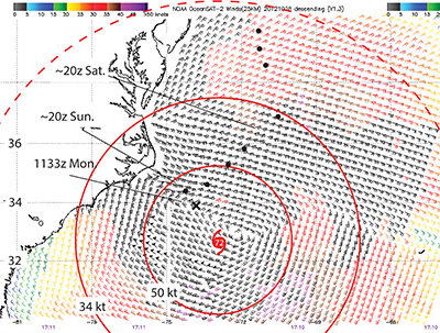 The satellite data here are from the Indian scatterometer OceanSat2 (OSCAT). The European instrument ASCAT is a primary source for this type of data, but it did not have a pass at this time. The sections it did show confirm that the winds were at least as strong as shown here. We have made a link to all of the scatterometer data along with a convenient way to get ASCAT winds by email at www.starpath.com/ascat.