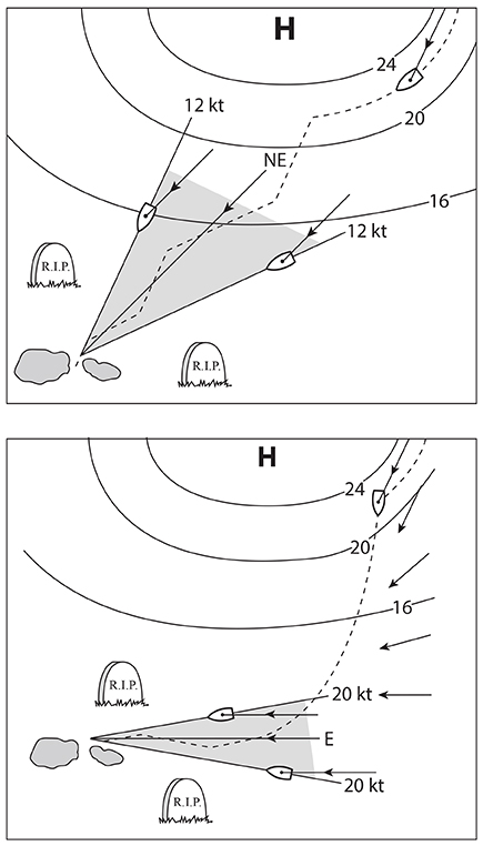 One obvious way to evaluate the forecasts is to see if the present surface analysis agrees with our own observations. To do this, we need calibrated wind instruments (to compute true wind speed and direction) and a good barometer. Then we plot our position on the weather map, read off wind speed and direction and pressure and compare to what we have recorded for these at the valid map time. If they agree, we have more confidence in the forecast. To the extent they do not, we have less confidence.