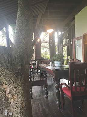 That evening, we wandered over to a resort near our anchorage. We tied the dinghy to the dock and walked up a groomed pathway where we found several cabanas, one with its own pool, and more gardens. The main building was two stories. A lovely veranda of dark wood and colonial appointments, upholstered rockers and tall louvered shutters to block out winds, graced the upper area.