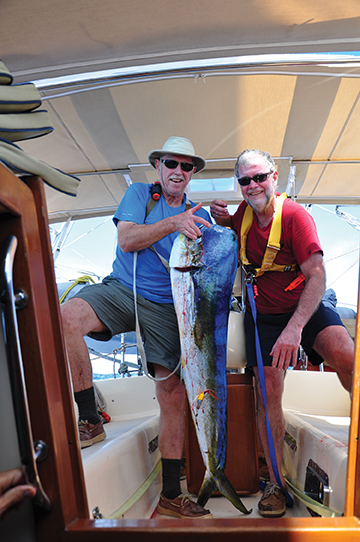 As the days become more routine, with the generally better weather of the trade winds, some diversion and the prospect of fresh fish for the table can come from trolling a lure, or maybe the flying fish you found on the deck one morning. (They not uncommonly go flying at night, only to knock themselves senseless when they hit the cabin in the dark.) Likely catch could be mahi mahi or wahoo, both excellent eating fish. A proper fishing rod and reel are good for this, but a hand reel with some stout monofilament and a bit of bungee cord to absorb the initial strike also works pretty well.