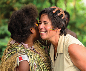 Headdresses of glittering garland, face paint, colorful grass skirts and brilliantly dyed feathers wrapped the women like magnificent gifts. Vibrant traditional lava lavas covered the men’s shorts while many wore a narrow wreath of natural fibers around their head into which a multicolored feather was precariously placed. In a blazing display of traditional costumes, the villagers radiated custom and culture. Jim and I were dressed up traditionally and our faces painted. Big smiles and hearty laughter, not at all malicious, welcomed us. Despite Winnie’s efforts, I’m fairly certain we did not completely blend in.