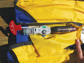 Next, inspect each vest for any tears or other damage. Check all the straps and clasps as well. If you find any damage just replace the unit. If your life vests are more than 15 to 20 years old you should consider replacing them even if they appear to be in good condition. If you have inflatable PFDs check them as well. Manually inflate them to check for leaks and make sure the firing mechanism is showing green and does not have any corrosion. Check any lights or other equipment attached to your PFDs as well. A light is no good if the battery is dead and most I check are.