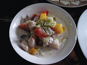 Sailing among the Polynesian archipelagos, Seth and I adopted more culinary habits than the tropical fruit. French baguettes were the only cheap item in the grocery store, so we ate an entire crusty loaf a day. We discovered poisson cru, a traditional dish of raw mahi mahi marinated in lime juice and served drenched in coconut cream with sliced cucumbers and sometimes tomatoes. If there were any available, Seth and I occasionally added bell peppers. It became our favorite dinner and we did almost nothing else with the mahi mahi that we caught or purchased.