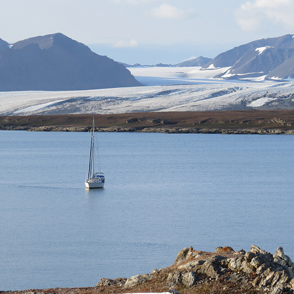 In later years the glaciers have retreated and it has become obvious that Blomstrand Peninsula is in fact an island. So much so, that it is now possible to sail around it on calm days. As the wind piped up, we had to leave the anchorage and it didn’t seem a good idea to sail in among the bergy bits, constantly calving from the glacier. Instead it seemed we could make it up Krossfjorden, which is split in the middle by King Haakon’s land, to Lilliehöek Fjord on the left and Miller Fjord on the right. There were lots of big ice floes in Lilliehöek, but seemingly only a few, very large icebergs in Miller Fjord. We wanted to get to the bottom of Miller Fjord and visit Lloyds Hotel, which is really just a small, trapper’s cabin. However, the wind increased—right on the nose —the waves got steeper and smaller, and bergy bits started to become frequent. After tacking and not getting anywhere, and seeing wind gusts over the 40 knot range, we decided to call it a day and tucked into Tinayre Bay, which in one of our many books on Svalbard, was described as the best and most protected anchorage in all of Spitsbergen. Well, there was a reasonable shelter from the wind and we did eventually get our trusty Rocna anchor to hold, and it wasn’t too rolly, but we wouldn’t call it the best anchorage we’ve seen up here. The next morning we made a feeble attempt to sail the last five nautical miles into Miller Fjord, and then decided we preferred to have the wind at our back and not risk the calving ice bits from the glacier.