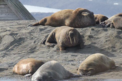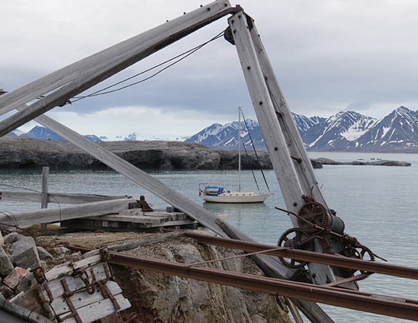 Next day we glided up Foreland Sound, and as we reached Poole Point we got the wind right on the nose. We could still see the walrus, but it was too choppy to go ashore or even stop. We just made it on one leg through the shallow and narrow opening in the reef—luckily the current wasn’t strong. The harbormaster at Ny Alesund recognized us from last year and bid us a hearty welcome. We stayed over a day, while a small gale whipped up the waves. The weather changed rapidly, and the morning came with beautiful sunshine, so we went over to London on the Blomstrand Peninsula. This is pretty much all marble and when the Englishman Richard Mansfield saw it, he thought he’d finally found his fortune. He headed the Northern Exploration Company in the early 20th century and had tried many places to ‘strike gold’—including several adventures around Recherche Fjord and Bell Sound. He started up big scale excavating of the marble on the peninsula, but alas, the marble crumpled when it was excavated. We walked all over the area, inspecting with fascination the remnants of this short lived adventure.