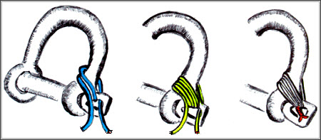 1. Cut off an eight inch length of stainless seizing wire. Hold two inches of the wire next to the shackle body with your thumb (illustration 1 – far left bitter end). Wrap the other end around the body and back through the screw-pin hole.