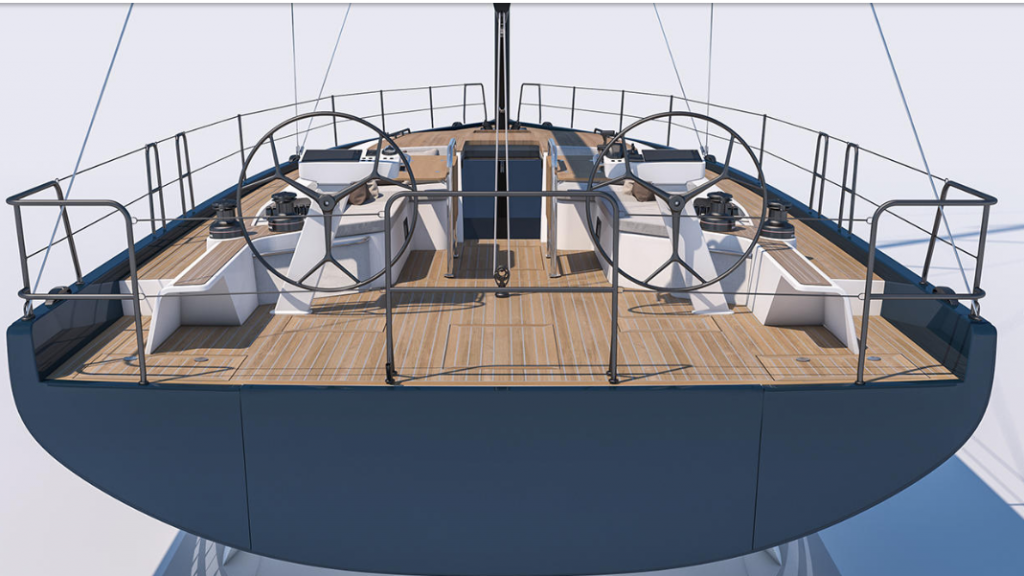 The boat has a monster sloop rig, a deep T-bulb fin keel and twin high aspect spade rudders, so it is set up for superior sailing performance around the race course or on passage offshore. The cockpit is broad and laid out with all sailing functions aft next to the twin helms and the lounging area forward where crew can be protected by a dodger. Under the cockpit there is a garage for a dinghy.