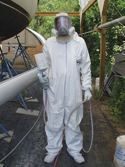 We selected Alexseal Top Coat 501 in Whisper Gray, a slightly gray white that seemed like the perfect mast color. Three coats produced a very glossy finish from the first coat up. A tiny bit of matched accelerator can be added to the paint to speed drying if dew is expected to form on the paint overnight or if you need a shorter time before masking tape can be applied.