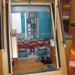 The engine room lies under the cockpit floor. This is a huge space with plenty of room for the 150-hp diesel, a fully enclosed generator, a watermaker and central air conditioning. Access to the engine room is via large doors on both sides and smaller doors aft. The boat’s electrical center has been installed under the companionway steps where the Mastervolt charger, inverter and circuitry for shore and house power are all laid out logically and are easy to reach.