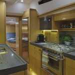 The galley lies in the passageway leading aft to the master stateroom. This fully equipped galley has a five-burner stove and oven, twin stainless steel sinks, a microwave and a large, front loading refrigerator-freezer. The Corian counters have low bulwarks all around to stop drips. There are numerous lockers and drawers and plenty of space for stores and supplies. This is a fine seagoing kitchen that will be safe and easy to use while on passage, even when things get bumpy out there.