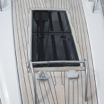 The teak decks are glued in place instead of being screwed so leaks will not be a problem. The detailing in the decking is of classic yacht quality with elaborate king planks and nicely joined deck planks. The deck hatches are flush with the decks and equipped with limber holes that drain away deck water. Stainless steel guardrails protect the air vent cowls that feed fresh air below decks. The cowls can be replaced with flush caps when the boat is heading to sea.