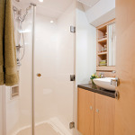 The forward head is across the passageway and has its own separate shower stall. This head will be the boat’s day head and will serve both the forward cabins.