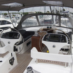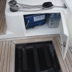 Since the boat carries its beam well aft, the after deck is very wide and home to a huge lazarrette. The cockpit has twin wheels with Lewmar Mamba steering that drives the semi-balanced, twin spade rudders. Each wheel was fitted with a 12-inch B&G Zeus multi-function display so you can navigate and sail to your best polars from both sides of the boat. The cockpit has a huge folding teak table finished with a flawless varnish job. Six can dine at the table comfortably. With all lines led aft to the helms, the cockpit remains uncluttered as you are sailing. The cabin hatch lowers into a cavity behind the companionway stairs and can be rigged at fully open, half open when at sea and fully closed.