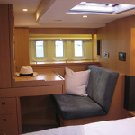 Going forward on the boat we sailed, we found a double cabin to port with single upper and lower berths and a large hanging locker. This could be the children’s cabin or would work well as a crew cabin. The huge hanging locker has ample space for full sets of offshore quality foul weather gear.