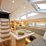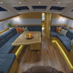 The 58 is a raised deck saloon design with a center cockpit and a large master cabin aft. As you descend the companionway, you find yourself in a bright and airy saloon with ample overhead hatches, large saloon windows and those amazingly large vertical hull windows. The views through these hull windows while seated anywhere in the saloon are remarkable.