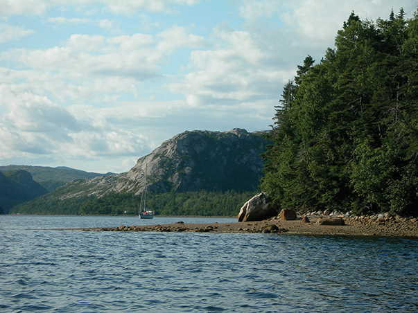 Five miles up the fjord, we dropped the hook at Sandy Point (47˚42’56” N, 56˚33’47” W), where we were surprised to find another boat at anchor. A red, Cape Island-style fishing boat that had been converted into a pleasure craft provided a colorful contrast to the backdrop of rock and pine trees. We jumped into our dinghy to explore further inland and came upon a luscious waterfall set in pink stone, so we scrambled up the rocks to dip our toes in the water.