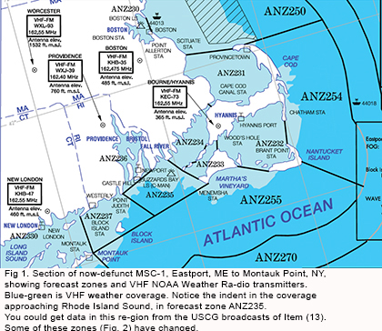 For many years the National Weather Service (NWS) published Marine Weather Services Charts (MSC) that listed crucial information for mariners using their services. There were fifteen charts that spanned all U.S. waters. The page size was 13- by 21-inches, printed both sides, with an annotated great-circle chart of the region on one side and all text on the other. The last printed versions of these are still to be found online from unofficial sources, but they are outdated. The NWS no longer supports them nor makes them available—the only exception is Alaska, MSC-15, which is still available from NWS, although they have trimmed down parts of the original content.
