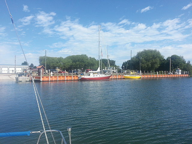 Tony hailed the Canadian lock but no one responded. He tried a couple of times then switched to an international frequency. Someone answered and informed us that the Canadian lock didn’t open until 9 a.m. It was about 8 a.m. at the time. While we waited, we tied up to the bollards on the canal wall and when we got the green light, motored into the lock and tossed our bow and stern lines to the man ashore. He threaded our lines through the vertical guides that line the lock wall and tossed the lines back to us. As the water level decreased, our lines slid down the guides and kept Aerie in place. Pretty slick.