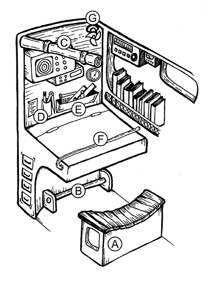 And you will need a way to lock yourself in place. A well-designed footstool that lets you brace your knees under the table is one, or a seat belt could do it. Another useful trick is a tight bungee cord stretched across the chart table near where you lift the lid. This holds the lid down in a broach (a safety requirement) and it holds charts and books in place in a seaway. It is not at all hard to work around during chart plotting. You can just pull the cord down over the lip to get into the table—i.e. to hand someone their sunglasses.