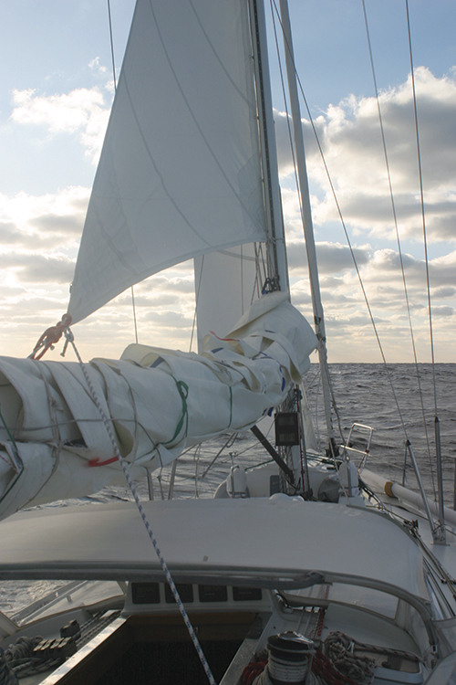 Sail changes are usually easier and more efficient when done early, whether sailing alone or with one other person. Of course, a hasty sail change may need to be reconsidered, but with roller furling headsails, changing down can often be relatively easy. If we’re going into the nighttime with unsettled conditions, I’ll often suggest reefing the main while daylight is still present. If less sail area is required later that night, rolling up a headsail can be quickly and easily executed—usually from the cockpit. And of course, clipping one’s harness to jack lines or a fixed point can prevent a personal disaster when going out of the cockpit in unsuitable conditions.
