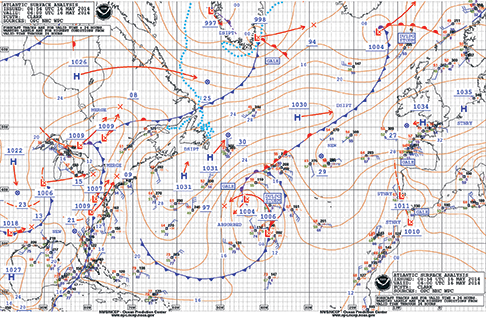 48 Hr Surf Press Frcst, N Atl, Valid 05 15 14, 12Z    Wind doesn’t travel concentrically along the isobars, though. The wind will tend to want to get away from the high-pressure area and be drawn in toward the low-pressure area. Hence, at the surface of the planet over water, wind around a high-pressure area will toe out from the isobars at about 15 to 20 degrees and toe in towards the low-pressure system by the same amount. Again, it’s saying essentially the same thing, but from a different perspective. If you were to draw arrows around the high in a clockwise direction, overlaid on the isobars, toeing them out from the isobars, away from the high by about 15 degrees, you would have a pretty good idea of what the wind direction is going to be anywhere on that surface pressure weather forecast map.