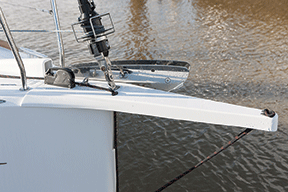 There is no traveler for the main sheet. Instead, the sheet runs along the boom to two blocks, one of which is attached to two Dyneema strops that hold the sheet block amidships. This is a really simple system and for those who want to trim the boom as you would with a traveler, you could exchange the strops for adjustable leads controlled from the cockpit.