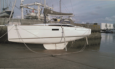 The 349 comes with either the standard or a shoal draft fixed keel with a bulb. Also, there is a swing keel version. With the swing keel all the way down, the boat draws almost eight feet. With the board raised, the 349 will sit out of the water balanced on the keel and the twin rudders.