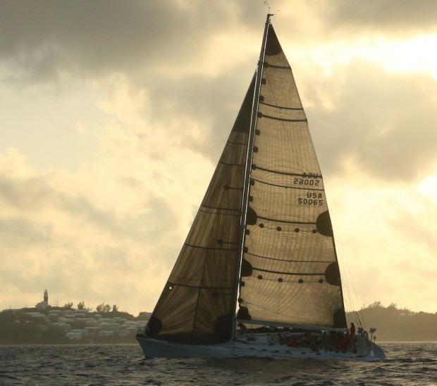 Mischievous grabbed the line honors in the 2015 Marion Bermuda Race with a splendid performance. She crossed the finish line at St. David’s Lighthouse Bermuda at the finish tower on Monday evening at 6:42 EDT. Mischievous is a Meriten 65 sailed by cadets from the Massachusetts Maritime Academy and skippered by Charles Cahill. Dozens of spectators cheered her as she crossed between the buoys that set the boundaries of the bearing from the lighthouse.