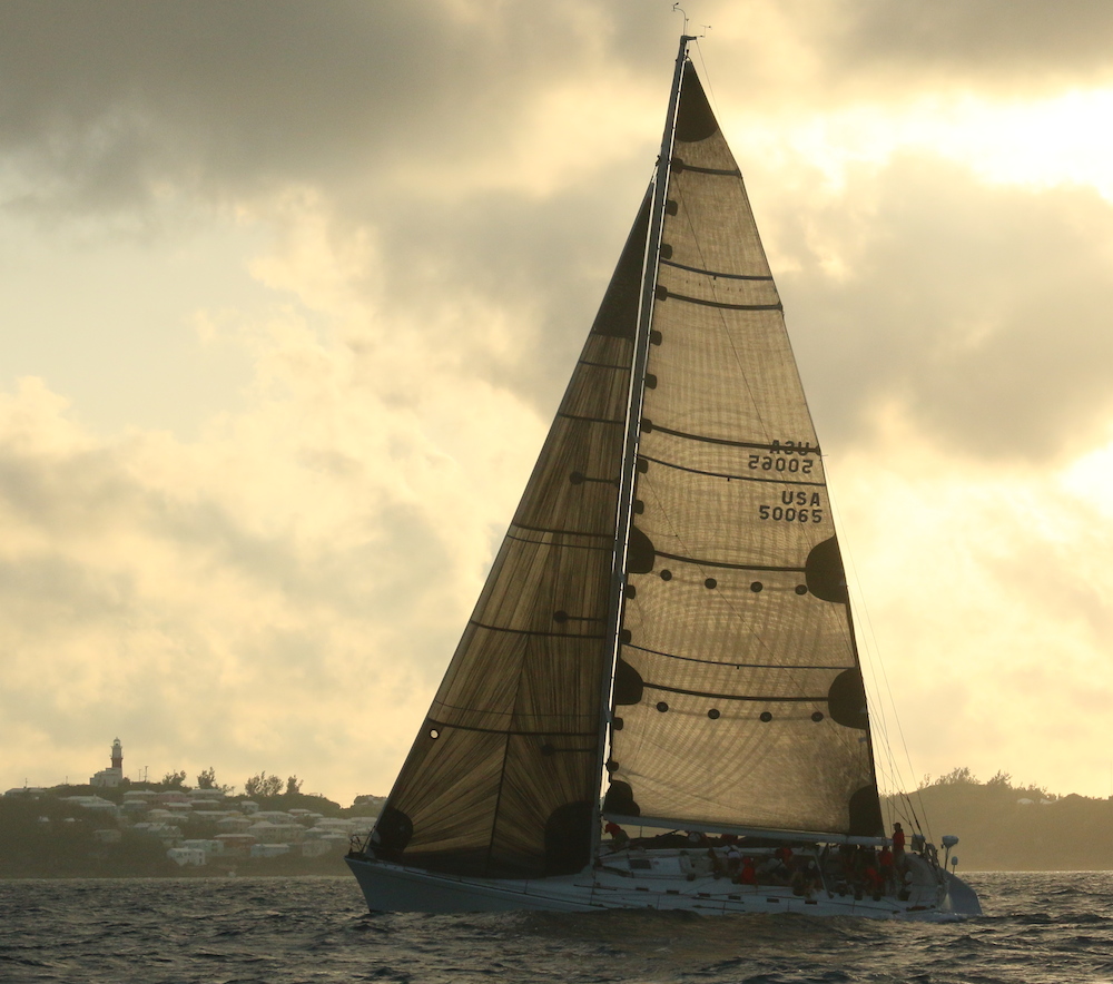Mischievous grabbed the line honors in the 2015 Marion Bermuda Race with a splendid performance. She crossed the finish line at St. David’s Lighthouse Bermuda at the finish tower on Monday evening at 6:42 EDT. Mischievous is a Meriten 65 sailed by cadets from the Massachusetts Maritime Academy and skippered by Charles Cahill. Dozens of spectators cheered her as she crossed between the buoys that set the boundaries of the bearing from the lighthouse.