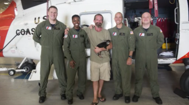 A 35-year-old man from Rome, Georgia, talks about being rescued and meets with the Coast Guard MH-60 Jayhawk helicopter crew that saved him, at Air Station Clearwater, Florida, Monday, July 13, 2015. The man and his dog, Evi, were rescued after his sailboat caught fire 69 miles west of Hudson, Florida, Friday, July 10. Watch Here.