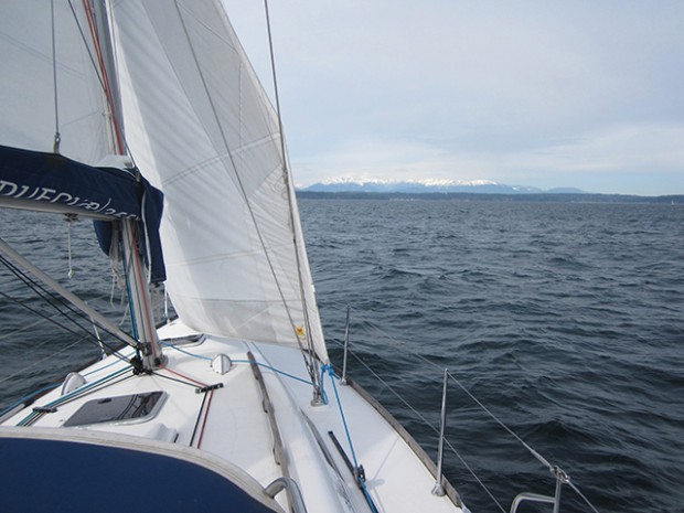 The ideal way to lay hove-to, especially in heavy seas, is at a 45° angle to oncoming waves. Laying abeam can be dangerous and unpleasant. To ensure you are not laying broadside to the swell, trim in the mainsail. Tensioning the main will bring your bow into the swell at an angle and make the boat’s motion more comfortable and safe. It will also keep the main from flogging noisily and causing unnecessary wear to the sail.