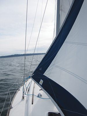 If you plan on being hove-to for a while, inspect the rig for places where lines and sails may be chaffing. On boats with an overlapping genoa, the sail will lay against the shrouds and spreaders. To relieve this, reef the sail or ease it slightly to move the clew off the shrouds.