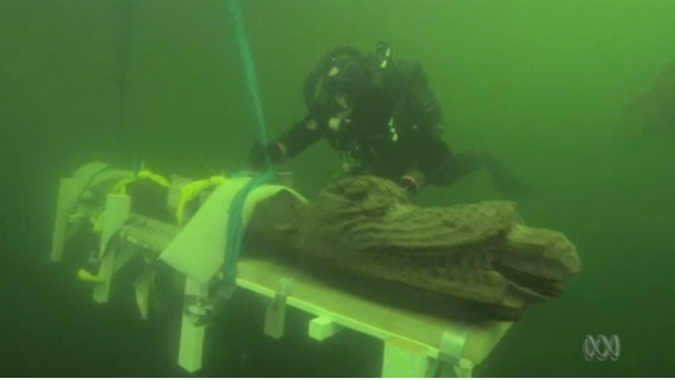 A wooden figurehead of a sea monster with ears like a lion and a crocodile’s jaw has been carefully lifted from the sea in southern Sweden by divers bringing up treasures from the wreck of a 15th-century Danish warship.