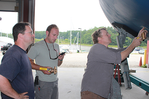 Normally, a surveyor will avoid destructive testing, taking readings with a moisture meter and tapping the hull with a rudder-tipped hammer. An experienced inspector will notice a spongy feeling on deck and pick up subtle differences between the hammer’s pings. If the surveyor suspects damage or weakness, he might recommend exposing a section of fiberglass or taking a core. It’s possible that key areas on some hulls are impossible to access without destructive measures (on our sloop, for example, the keel bolts are glassed over). This means an owner must decide whether to leave well enough alone or to go all the way by opening up these areas. This decision can be based on the boat’s age, history and any evidence of possible damage.