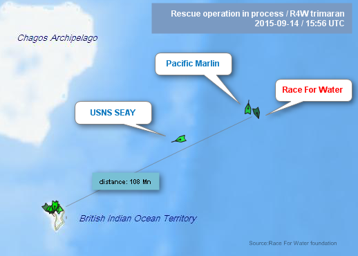 On her way from Palau to Chagos Islands, in the Indian Ocean, the MOD70 trimaran Race for Water capsized on Saturday night, 90 miles south east from the Chagos Archipelago. Thanks to the assistance of the military base in Diego Garcia, the crew was rescued by the Pacific Marlin, a ship from the British Indian Ocean Territory (BIOT). The crews of both the Pacific Marlin and the Race for Water are currently attempting in difficult conditions to right the trimaran.