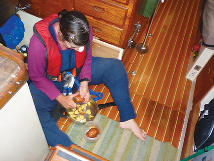If the movement of the boat is too erratic, clean a space on the floor and work sitting down. Or take a small cutting board and paring knife out to the cockpit while on watch and do all the chopping and slicing al fresco, scraps can get tossed directly overboard, sea water can be used for cleanup and fresh air prevents feelings of sickness. Don’t forget that heaving to is also an option, giving you a break to cook and eat. Cooking underway is not a timed event, nor is it a solo sport, so divide the work load, don’t rush and ease the stress come meal time.