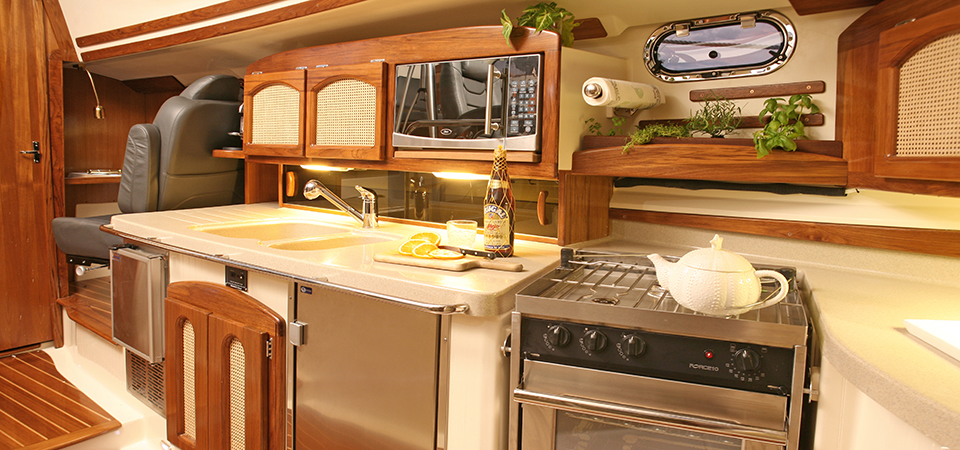 Sight lines are good from the helm station, and all sail controls are led to the cockpit, with a power winch for the main halyard and electric furling for the jib. Stainless handrails are everywhere, and along with wide side decks, they make moving to the foredeck more of a comfortable walk than a chance to practice one’s ballet skills.