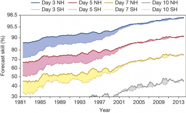 This figure from a recent Nature article is a nice representation of the advances in weather prediction over the past 35 years.
