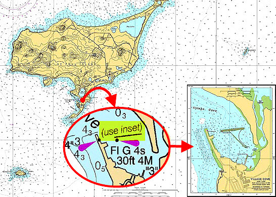 Look just inside the area of Village Cove and you can see the chart note that says “See Inset”. Some chart makers save lots of time and money when they insert large scale chartlets onto the smaller scale chart.