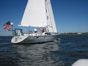 The breeze increased as we left the mouth of the bay and so did the feel of weather helm on the wheel. We eased the traveler, which runs across the deck just aft of the center cockpit, and that corrected the helm nicely.