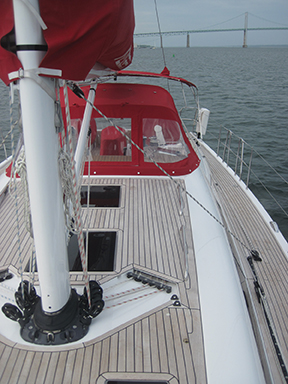 azuree46helmWe had just five aboard for the race, Alan and Sarah Baines, Greg Ferguson, Eric Archer and myself. Between us we probably had 150 years of sailing experience. In fact, Greg has sailed as a pro in years past. He was going to call tactics. Also, the 46 is endowed with massive cockpit winches, two of which were electric. And it has cabin top winches that also include one electric model. We weren’t going to be doing a lot of grinding nor were we going to be flying a spinnaker since we were in the cruising division.
