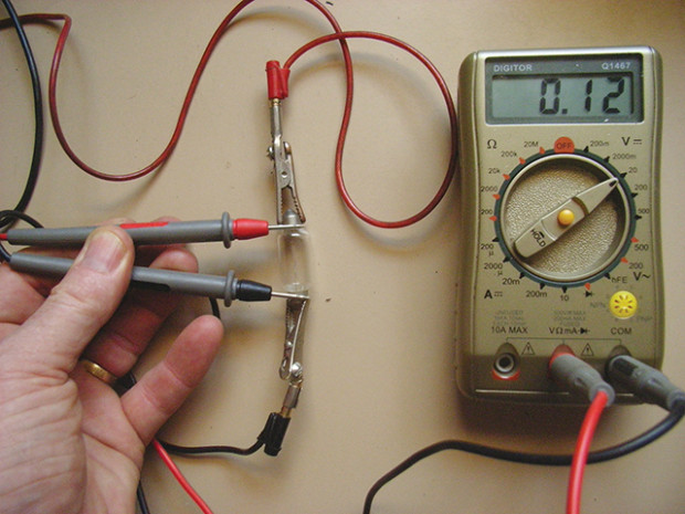 Resistance is the electrical opposition to the flow of current through a circuit. A simple and practical use for this type of measurement is to check if a circuit is continuous (test a fuse or a light globe). By setting the meter to resistance, the needle or digital display will show the measured resistance of the circuit or device. It is a good test to check if a masthead lamp is intact without having to do the climb. If you get a resistance reading (around 5 ohms) at the base of the mast, then the globe and wiring are probably intact. The unit of resistance is the ohm, its symbol the Greek letter Ω. Before taking a resistance reading, touch the probes together and use the ohms adjustment (usually only on analog meters) to set the pointer to zero. This compensates for any resistance in the probes for the measurement you are about to make.