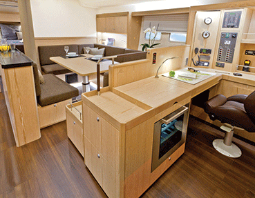 The saloon has the galley to port and the big dinette to starboard. The galley runs the full length of the saloon and has a large fridge and freezer and room for a dishwasher. The wine cooler is tucked into the furniture aft next to the chart table.