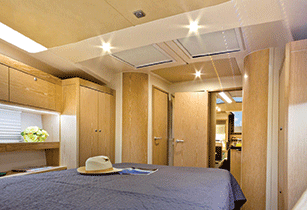 Hanse575interiorThe boat we sailed had the three-cabin, three-head layout. The master cabin lies forward and offers a centerline double berth that has plenty of space around so it is easy to make up the bed and to climb in and out of it without disturbing your mate. The head and shower have their own compartments to port and starboard. There is plenty of locker and hanging space forward for carrying all the clothing you will need for living aboard and sailing through different seasons and climates. The large windows on both sides of the hull are positioned so you can lie in bed and watch the world go by.